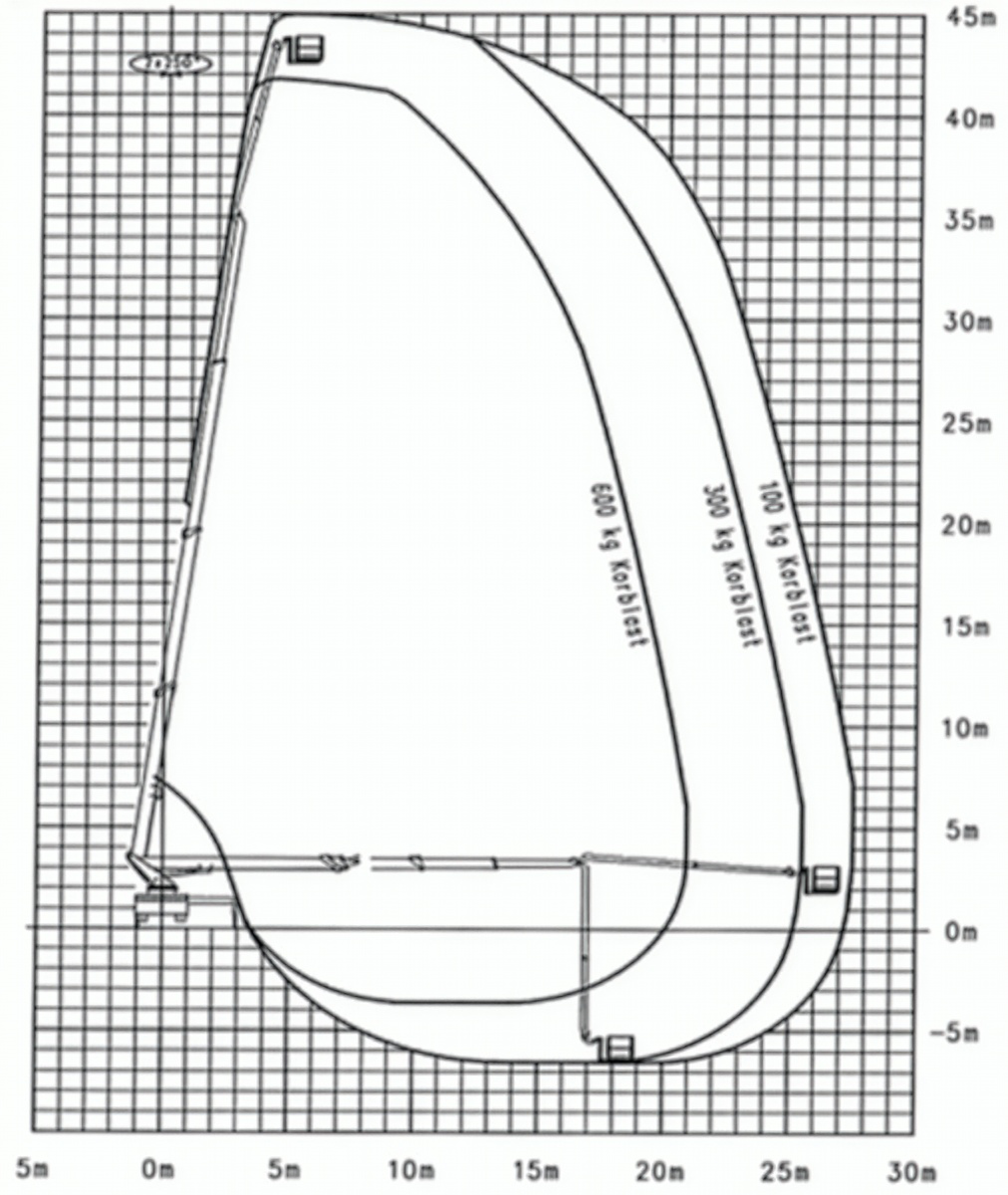 Seitliche Reichweite 13,50 m - 15,50 m (übers Heck bei 100 kg im Korb)